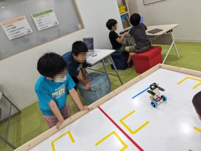 まっすぐ前に進む、後ろに下がるというプログラミングの次は、向きを変えるプログラミングの学習をしました。