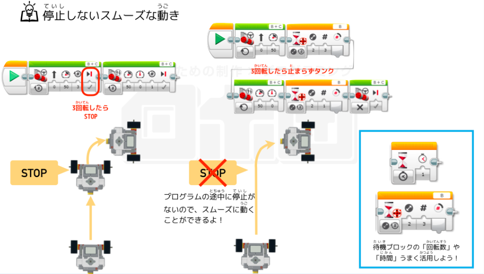 これまで学んできたブレーキがかかってしまうプログラムと、今回学んだブレーキをかけない場合のプログラム比較です。