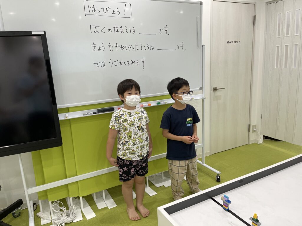 授業中に作ったロボットをみんなの前で発表、作ったプログラミングを説明など、自分の言葉で表現してもらう時間があります。コミュニティーの中で自分を表現すること、とても大切です。