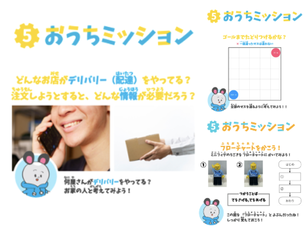 レッスンの最後にご家庭で取り組んでいただく「おうちミッション」の内容を説明します。その日のレッスンで学んだことを自宅や学校など、身近に使われているものに紐付けることで、子どもたちの視野を広げていくことを狙いとしています。
