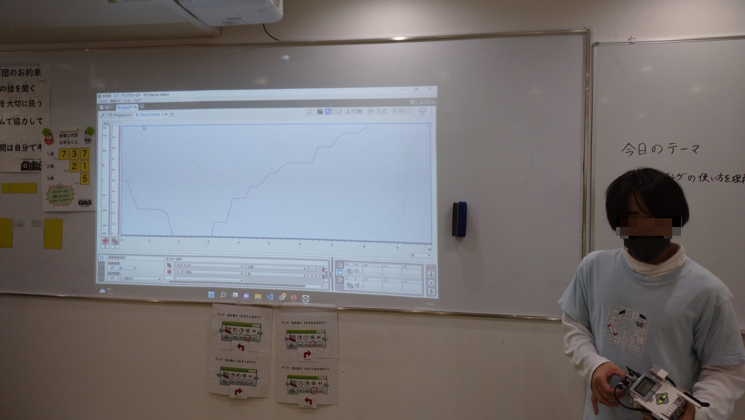ロボ団で使用しているEV3では色々なデータを取ることができますが、例えば複数のカラーラインの並んだところをカラーセンサーで順番に読み込んだ時のデータであったり、モーターの動くパワーやスピードが一定時間内でどう変化するかなど様々あります。そのデータをPC上ではグラフで見ることができるため、取ったデータがどのようなもので、それをどのように解釈できるかなど、動きの分析に役に立ちます。