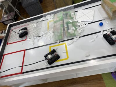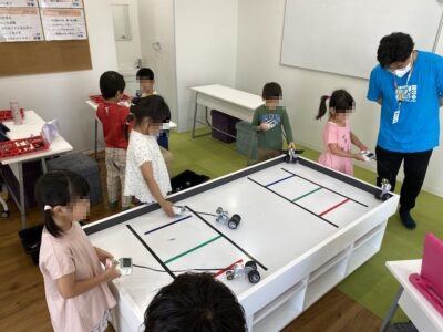 インテリジェントブロックをコントローラーに、作った車型ロボットを前後に動かすことを体験してもらいました。